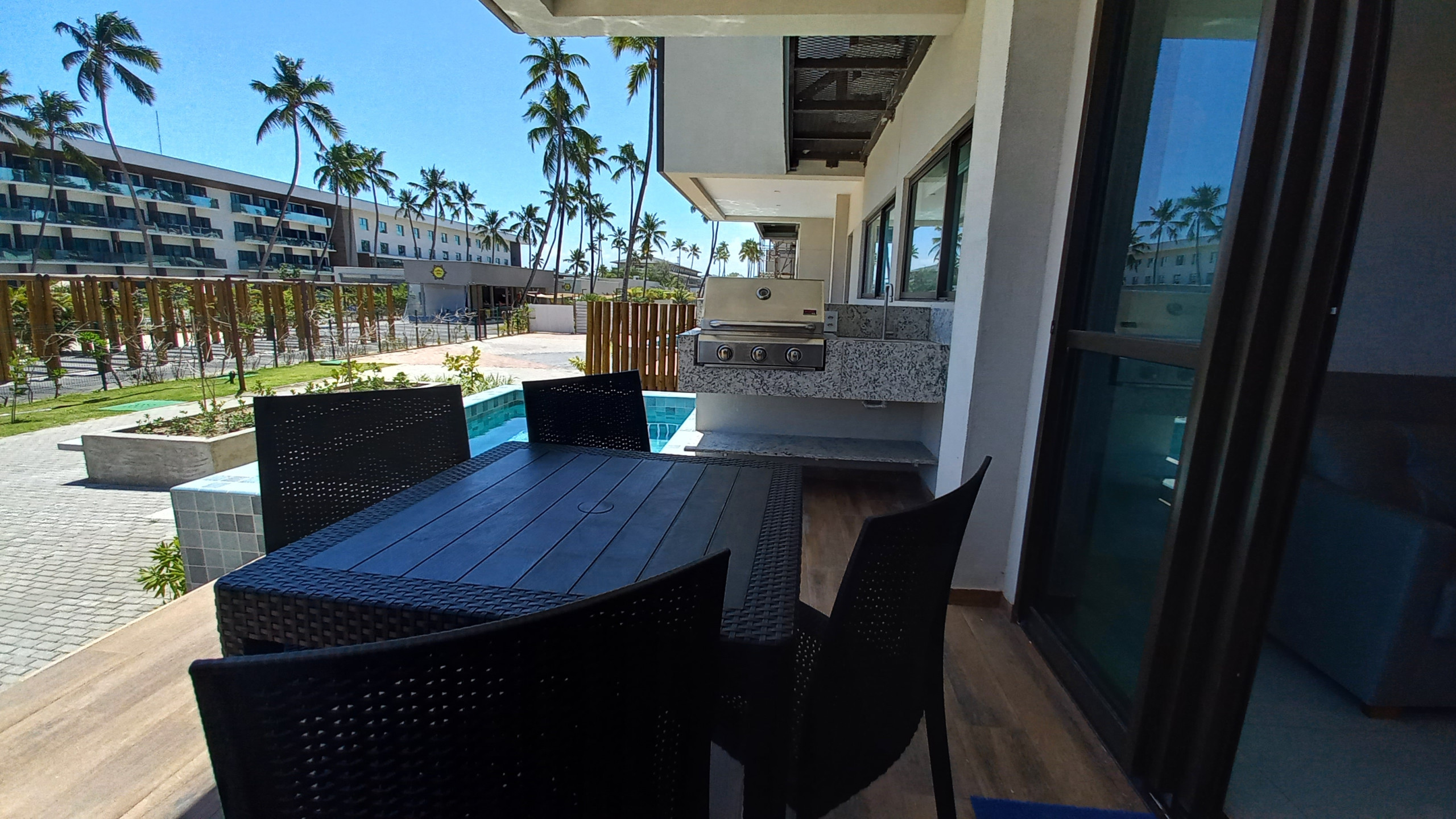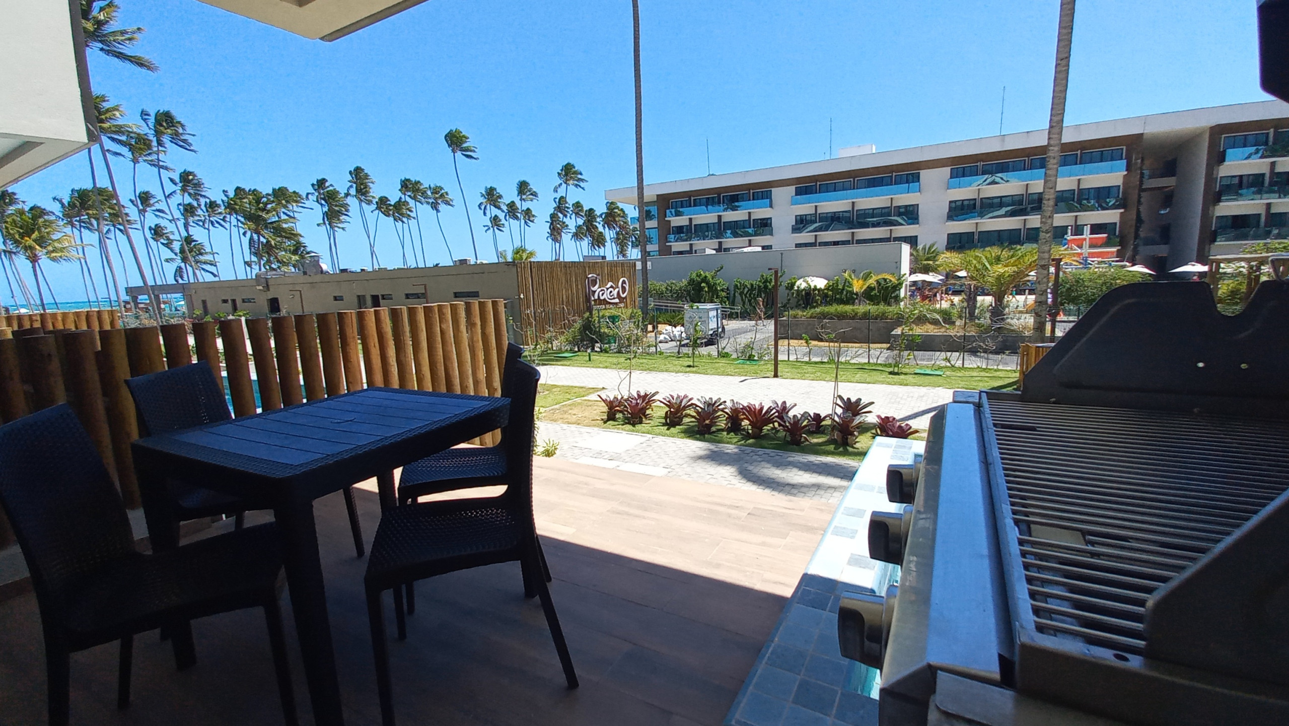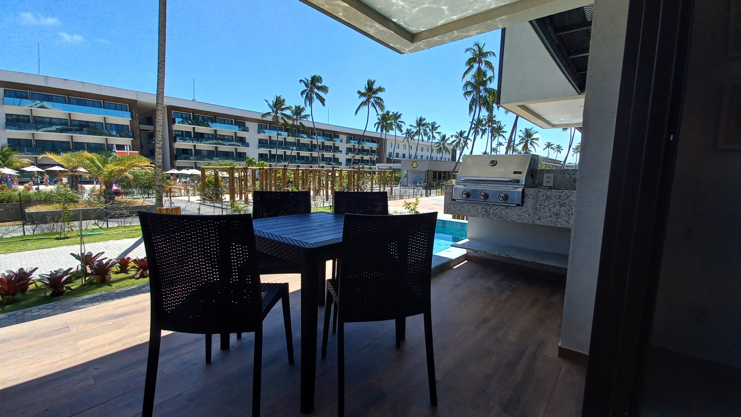 Desfrute de momentos relaxantes na ampla varanda com a piscina privativa, churrasqueira, espaço equipado com cadeiras e uma mesa, enquanto contempla a vista deslumbrante do complexo do Ipioca Beach e sua praia.