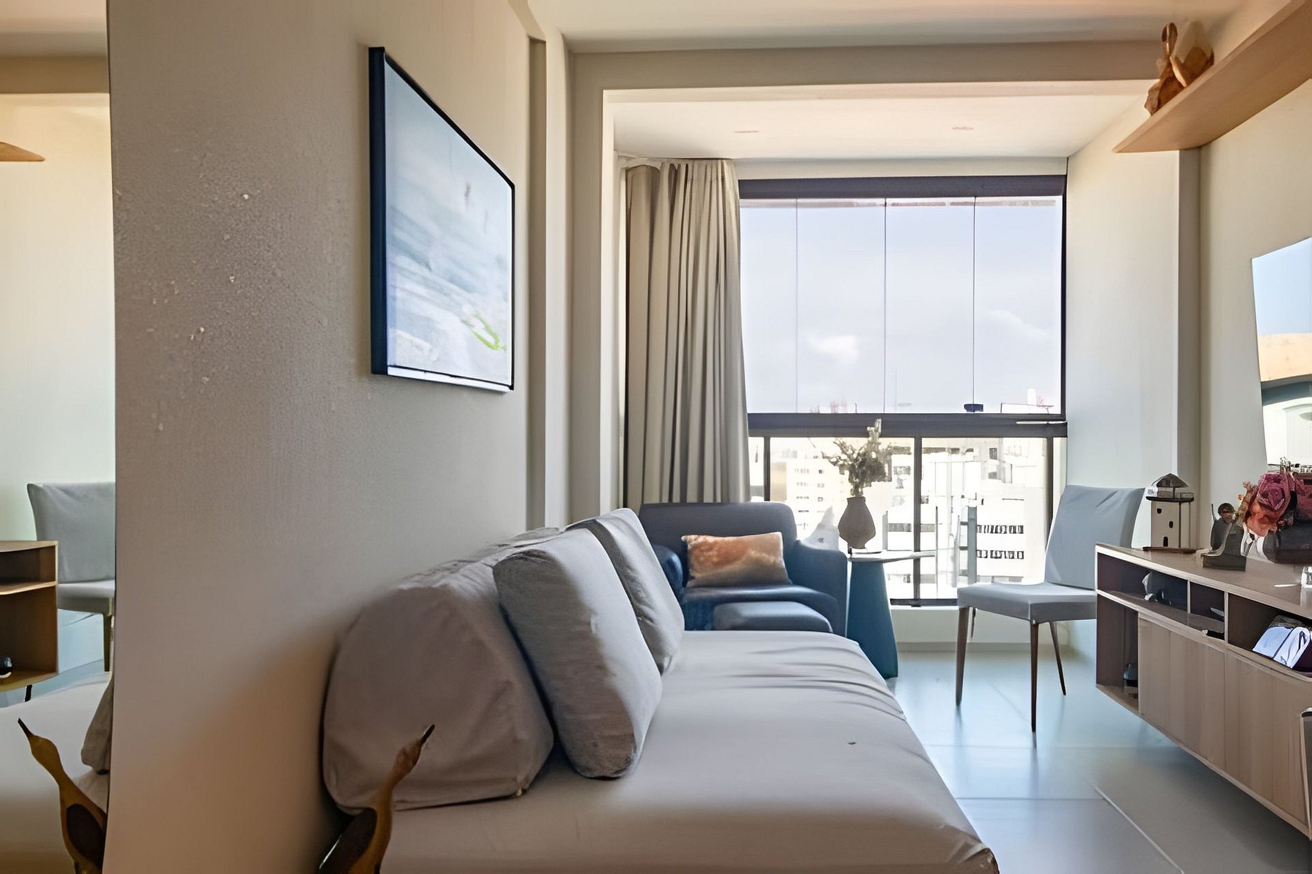The apartment comfortably accommodates up to 05 guests in a suite with wardrobe and air conditioning, bedroom with two single beds. The charming living room - equipped with a single sofa bed, Tv, air conditioning and partial sea view; is integrated with the complete kitchen and service area.