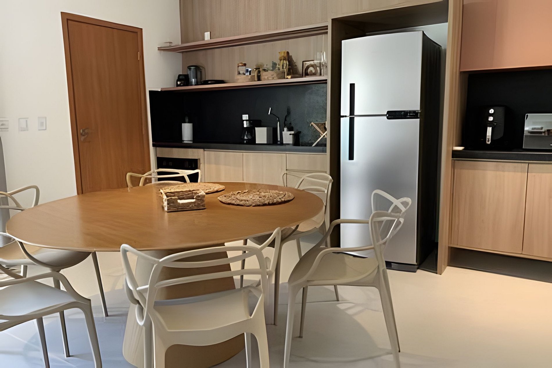 The fully equipped kitchen, with essential utensils, allows you to easily prepare meals. The space harmoniously integrates with the rest of the areas, making the experience even more enjoyable.