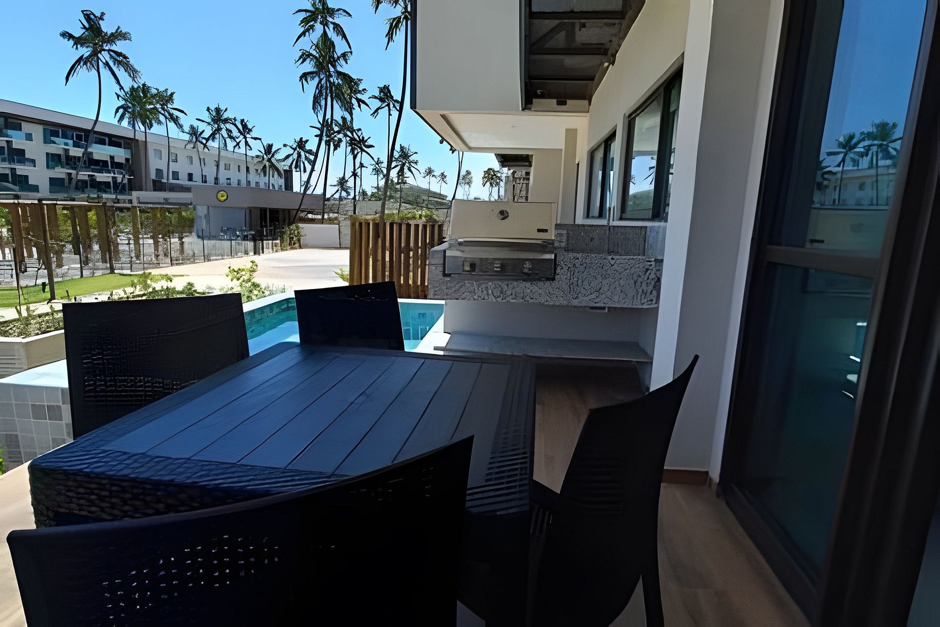 Disfrute de momentos relajantes en la amplia terraza con piscina privada, barbacoa, espacio equipado con sillas y una mesa, mientras contempla la impresionante vista del complejo de Ipioca Beach y su playa.