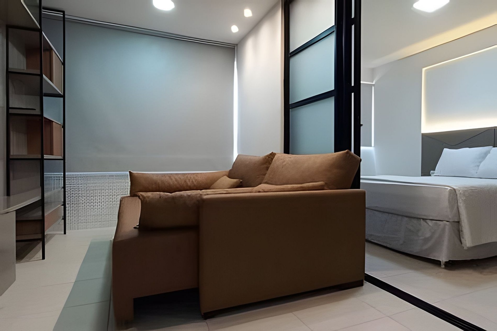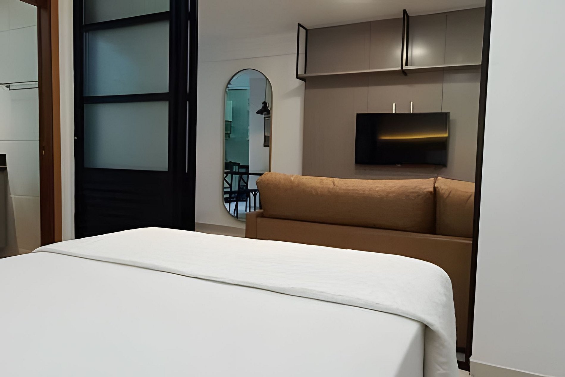 Apartamento acomoda confortavelmente 04 hóspedes, dispondo de guarda-roupa e ar condicionado. A sala de estar, equipada com um sofá-cama de casal, pode ser compartilhada com o quarto, e conta com Tv e ar condicionado. Integrada à sala de jantar e à cozinha completa, a área de estar traz conforto e comodidade para a sua hospedagem.