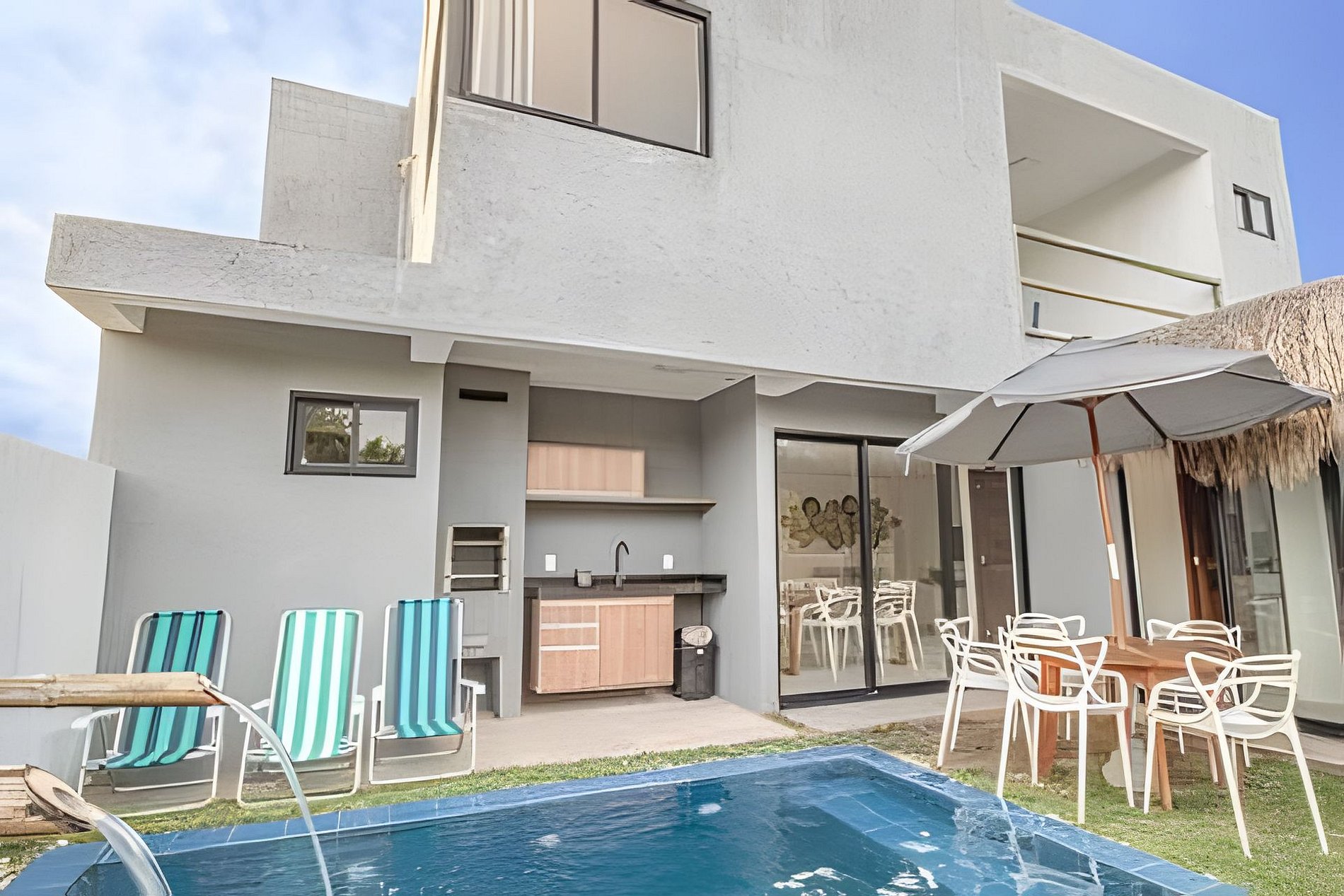 Acomoda confortavelmente até 6 hóspedes em suas 3 suítes, todas equipadas com cama de casal. A casa dispõe de um lavabo, sala de estar integrada com a cozinha, sala de jantar e uma área gourmet completa. Além disso, você poderá desfrutar de uma piscina e churrasqueira para momentos de lazer.