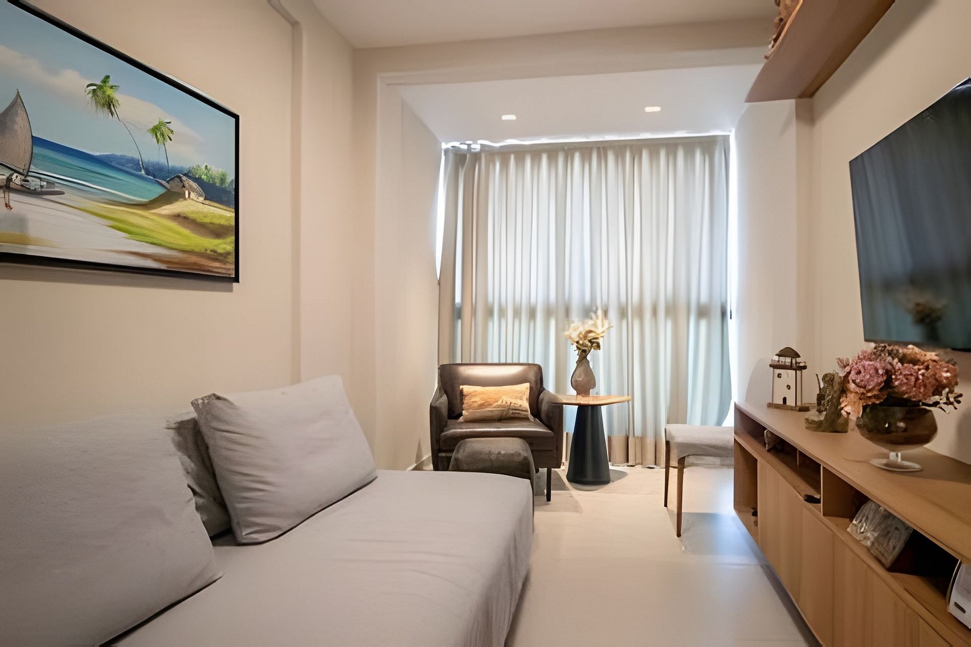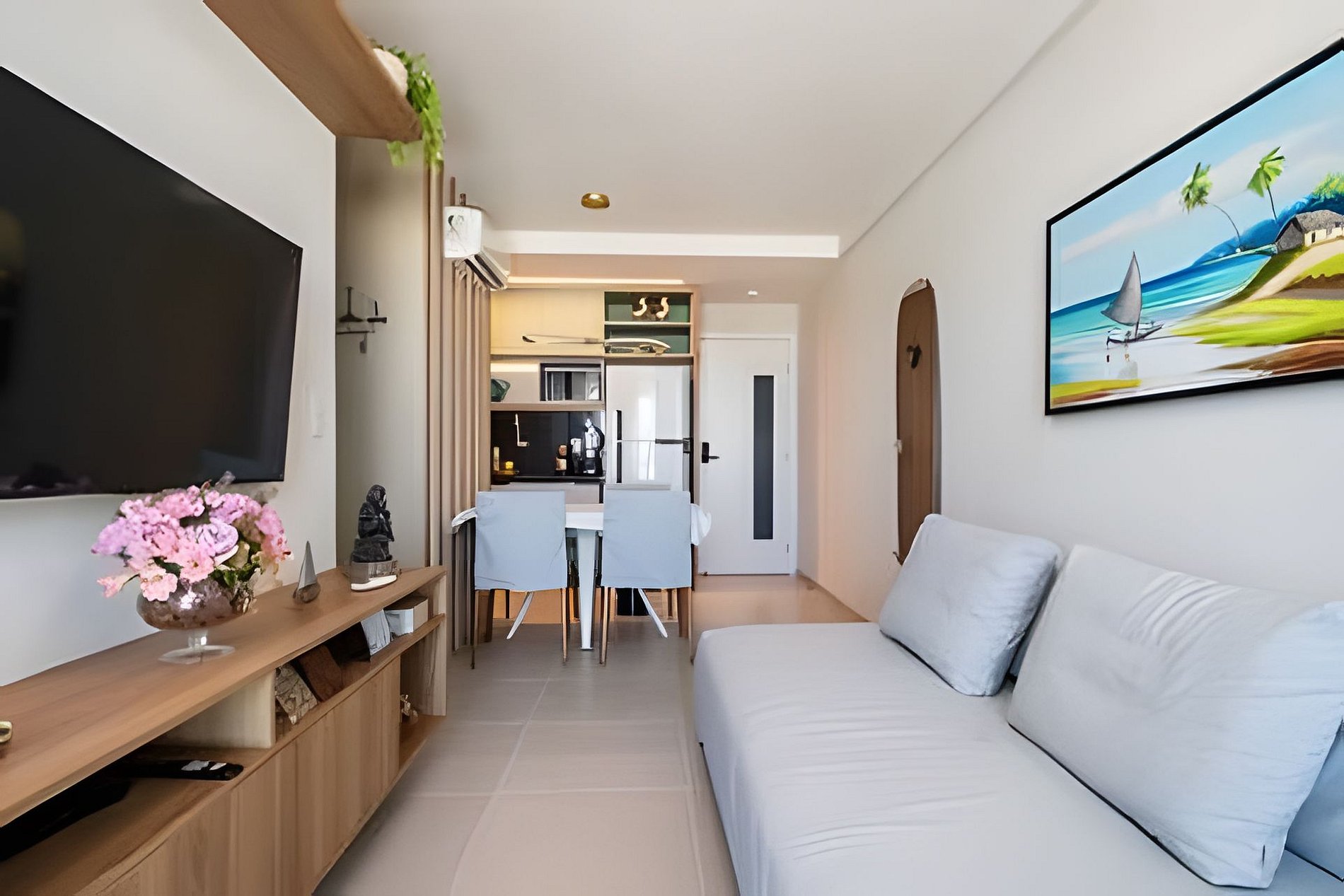 O apartamento acomoda confortavelmente até 05 hóspedes em uma suíte com guarda-roupa e ar condicionado, quarto com duas camas de solteiro. A charmosa sala de estar - equipada com sofá-cama solteiro, Tv, ar condicionado e vista parcial para o mar; está integrada à cozinha completa e à área de serviço.